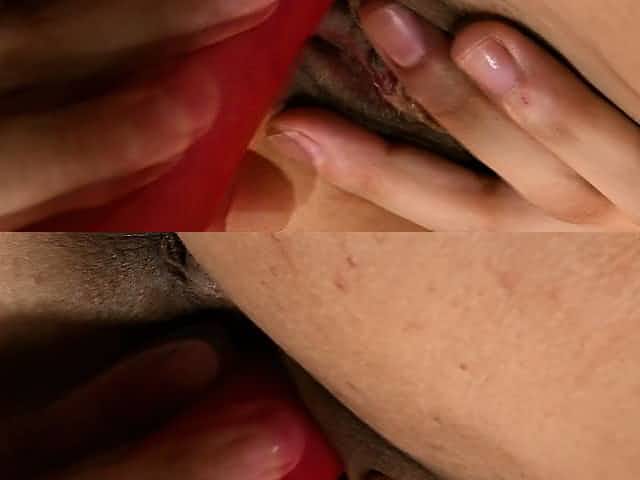 Short-haired babe in a flashy red corset jams a dildo in her cunt