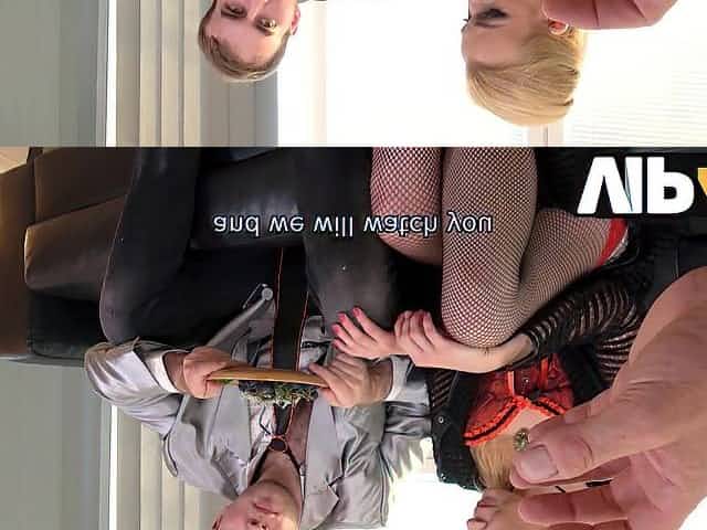 Pleasant blond hottie in a latex corset is about to get team-fucked in front of the camera