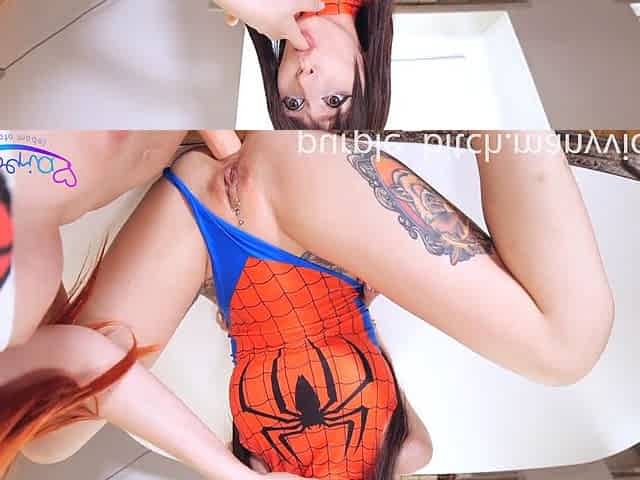 Spiderman cosplay girl-on-girl anal fun with adult toys and cupcakes