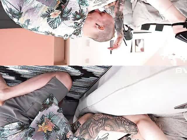 MILF with tattoos rubbing her clit while fucking on the couch