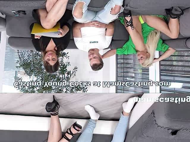 Two lesbian chicks flirting on a couch but the real fun starts when a horny cougar walks in