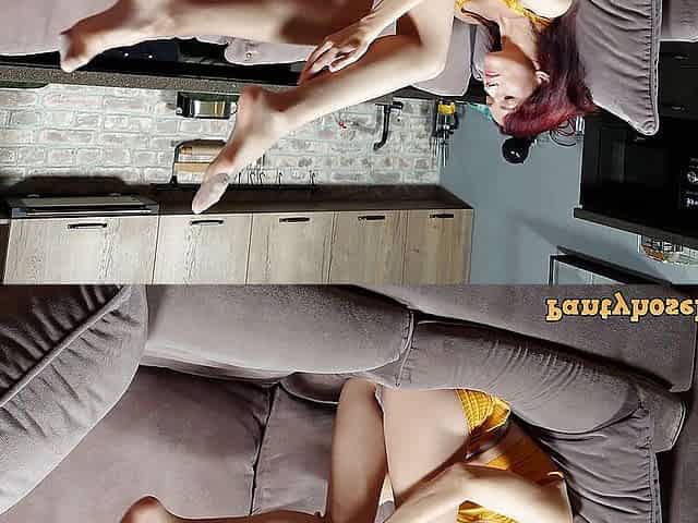 Horny small tits Lara in yellow skirt gets horny on the couch in pantyhose