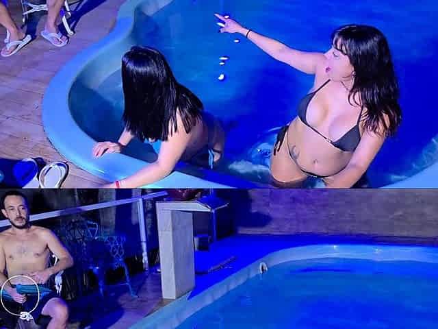 Caught in the act! Two brunettes get caught masturbating in the condo pool