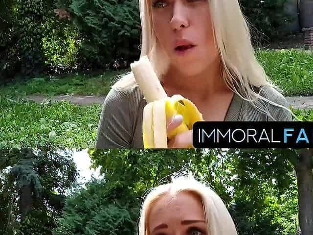 Awesome blonde with nice tits Angelique Rose jumps on a big cock