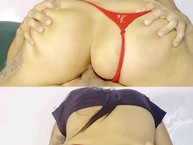 Lubed sex clips featuring Lia Lin and Yeri Blue up close with big tits and brown pussy