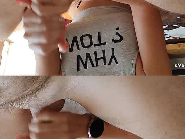 Milf masturbates cuckold and tells him how he will suck her lovers cock