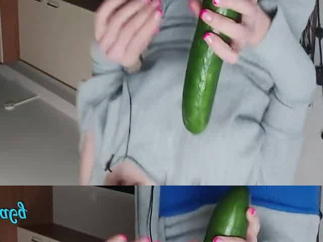 Joyful teenager wit big titties masturbates with a massive cucumber in kitchen