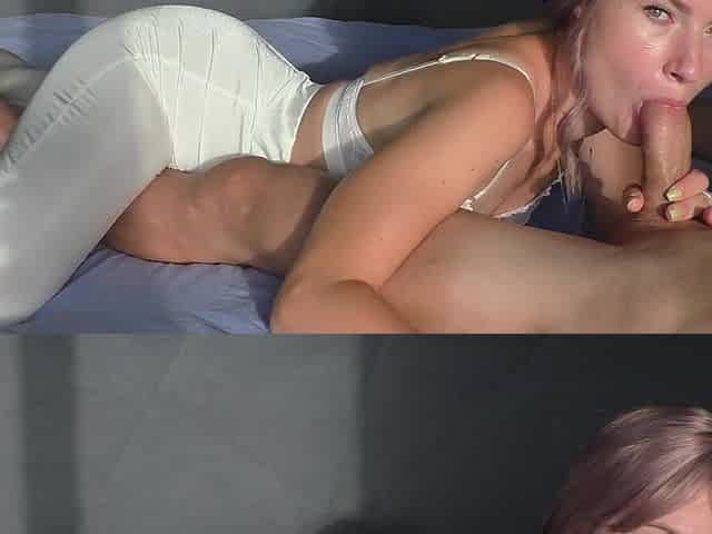 Purple-haired cutie in white leggings sucks a large weenie and swallows all the cum