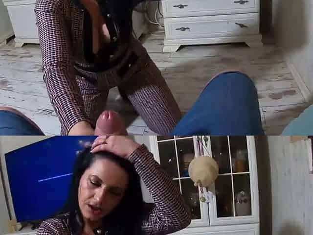 Tight Jumpsuit, Furry Boots Messy Deepthroat with a Cum Licking Finish