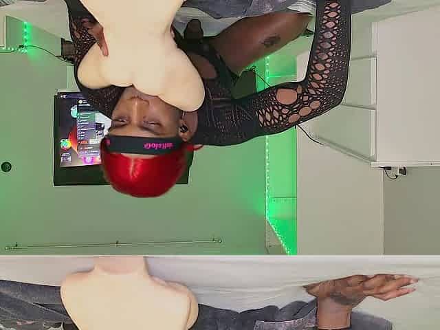 Brunette hair t-girl in ebony underware makes a giant ejaculation on