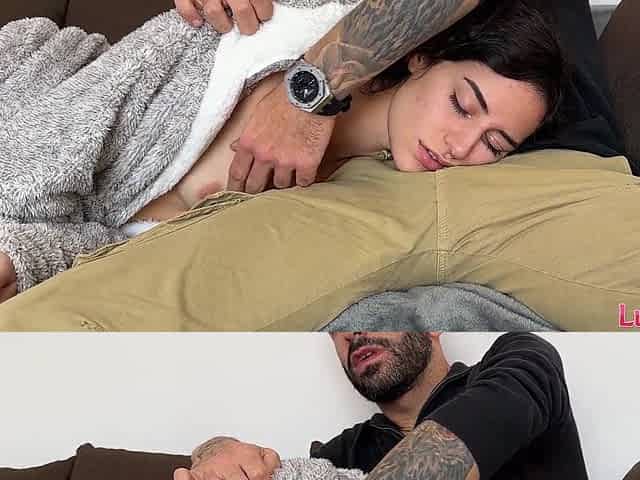 My stepmom enjoys playing with my huge boobs as I relax. Giving handjob, covered in cum