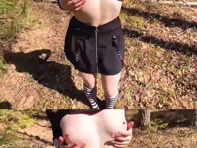 Redhead is not afraid of being caught eating sperm in a public forest