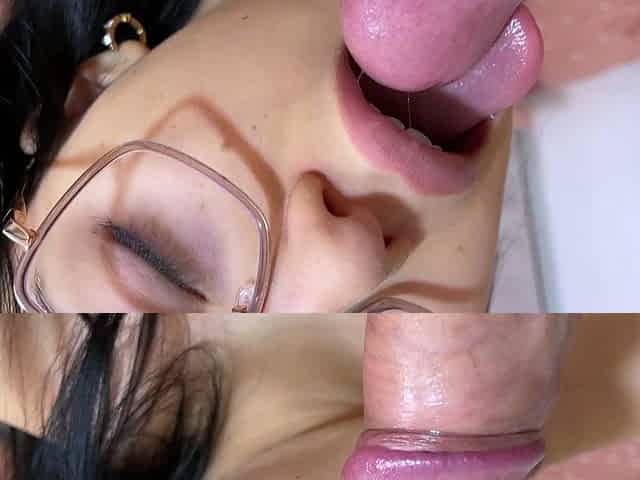 Petite Brunette With Big Glasses Is Sucking Her Best Friends Cock And Eating Fresh Cum