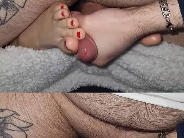 Up close footjob as Feetcouple95 gets covered in cum on her little red toes