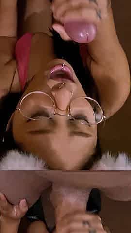 Gal with glasses sucks ramrod and eats cum.