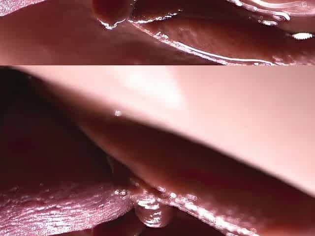 SLOW MOTION. Incredibly close-up. Goo trickling down the snatch