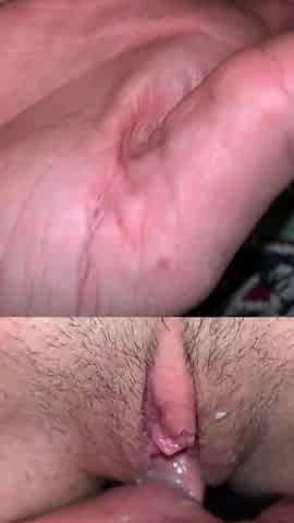 Youthful cutie is overspread in sperm all over her body. Creampie. POV, close up.