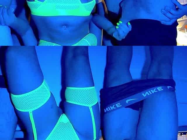 Threesome with wife deepthroating two cocks under neon lights - Full scene