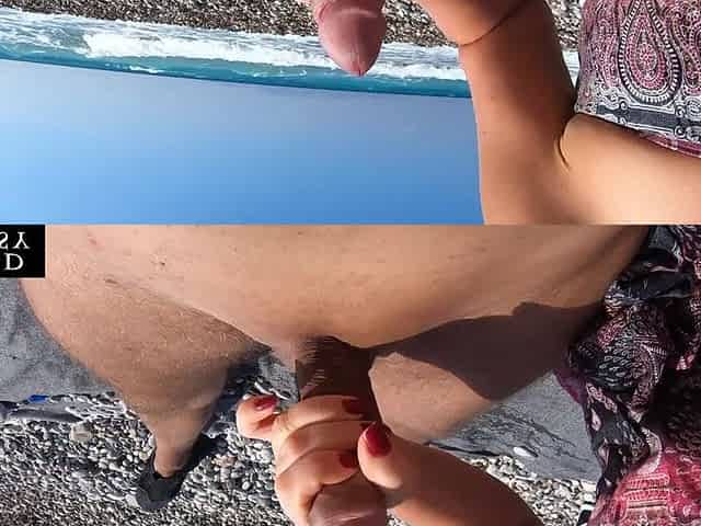 Jerking off My Boyfriend at a Beach - Quick Risky Outdoor Handjob with Huge Cumshot