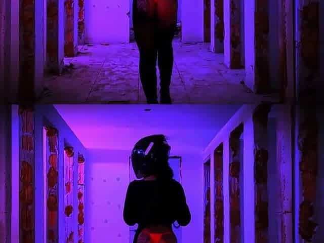Female bodybuilder Lxght flexes and poses with a lollipop in a virtual world