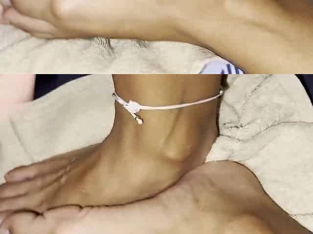 POV 18 year old French Latina Slut gives footjob and ends up with cum on her feet