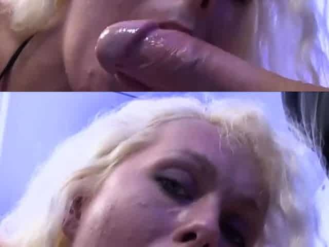 Curly haired blondie slurps two dicks for facial love