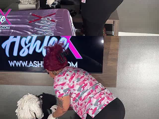Raven-haired hottie Ashly Rabbit nicely plays with her wet shaved pussy