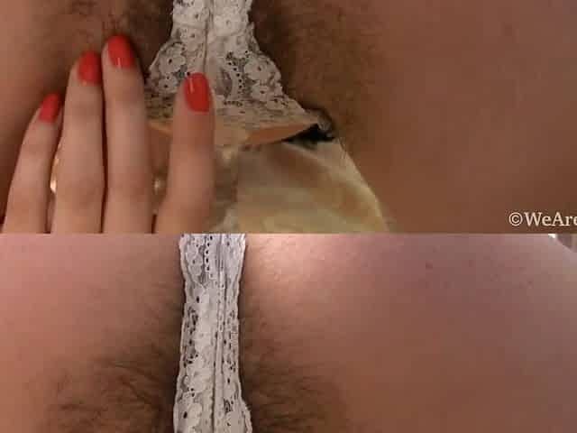 Curly brunette wearing lingerie with a big clit gets fucked and then fingered until impressive squirt