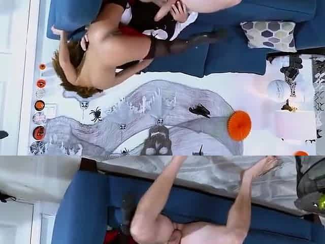 Busty curly brunette with big boobs fucks on couch