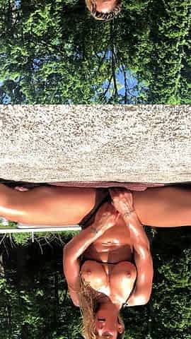 Outdoor solo masturbation scene with curly blonde