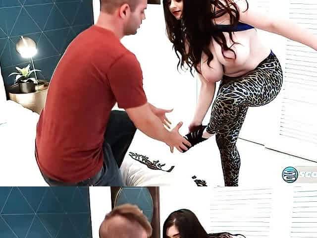 Busty curly brunette with big boobs fucks on couch