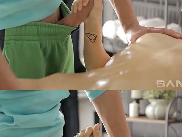 Curly haired sweet chick Caroline gets dirty with kinky stud in massage parlor