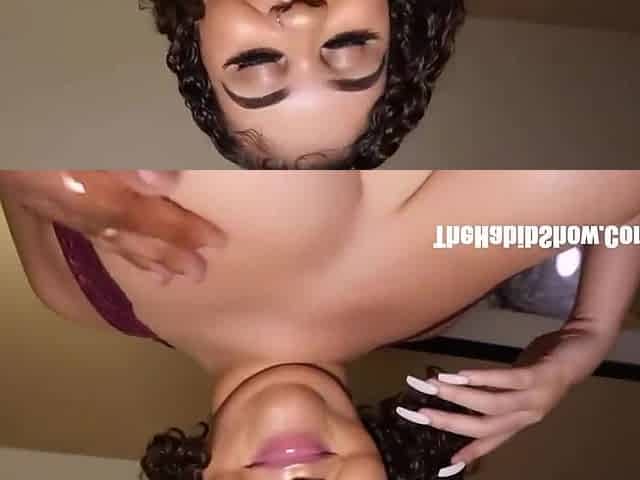 Mouthwatering Latina with curly hair show her bosom