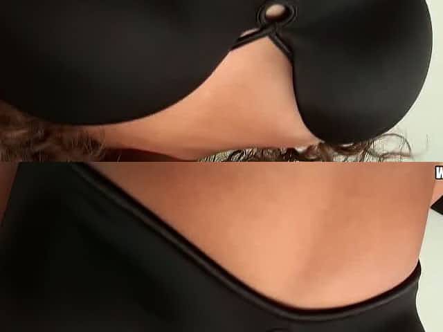 Beautiful Latina with brown curly hair flashes her soft plump tits and her sexy body