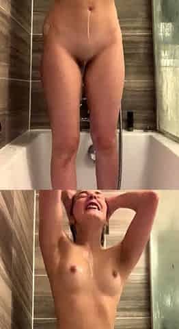 Two naked women – a sexy blonde cougar and an adorable brunette – shower together in a taboo family nudism scene