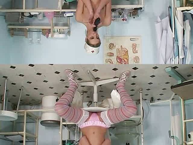 The blonde nurse masturbates with a big black phallus in front of the patient on crutches