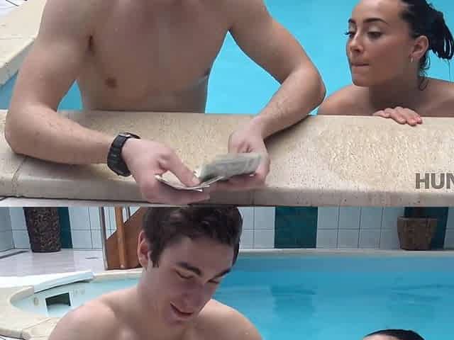 Poolside sex with a brunette who does not mind tasting strangers