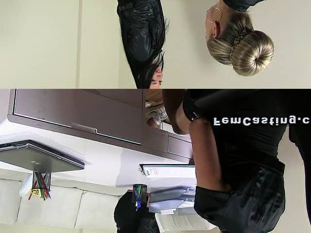 Busty female agent strap on sex with brunette babe