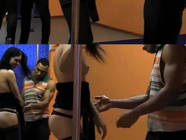 Blonde pole dancer Cristal services three clients right near the pole