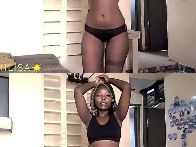 Flawless body darksome skin Afro village hotty dancing in Raffia half stripped outdoor