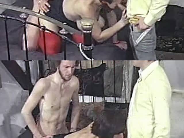 Hot MILF in sex swing with two boys, cum in mouth
