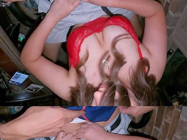 Timid dark-haired beauty gives sloppy blowjob to huge white dick (POV)