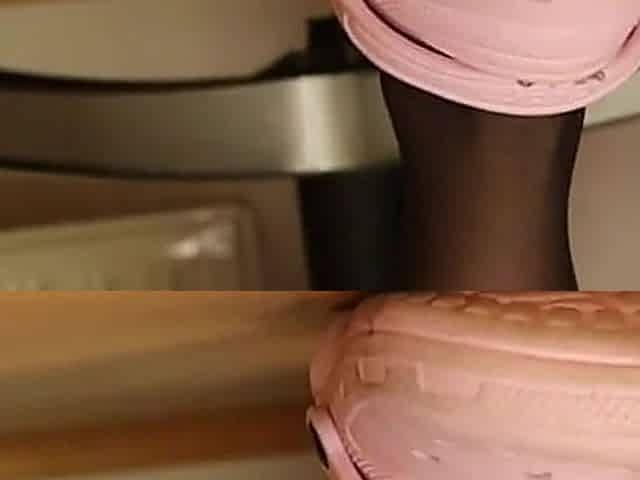 Ripped Black Thigh Highs in Worn Pink Clogs - Under Desk View