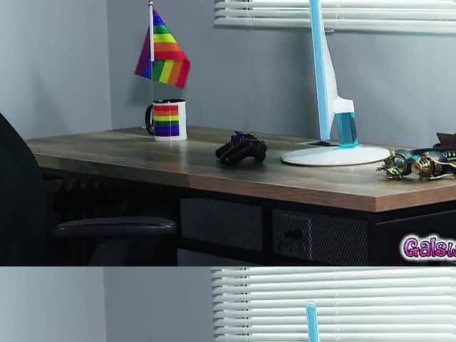 "Randy cum chugging slut gets dick deep inside her ass and twat on the desk"