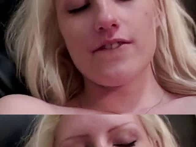 Young slim blonde babe props her leg on desk to open her pussy for dildo