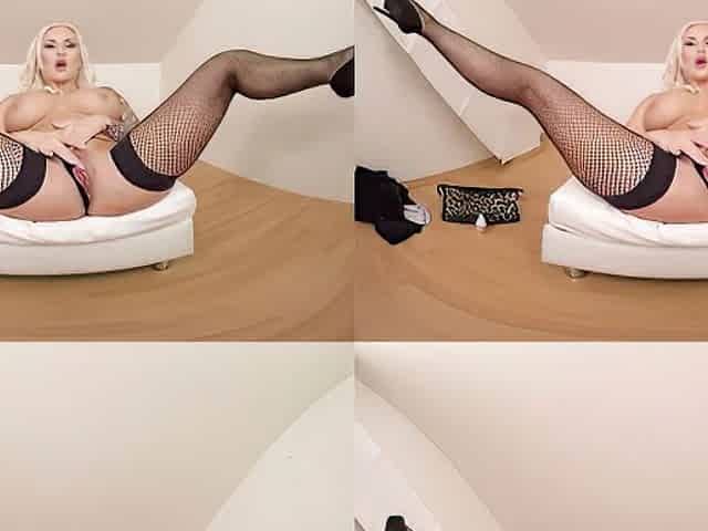 Doll with gigantic silicone tits Princess Pumpkins fucks with a dildo