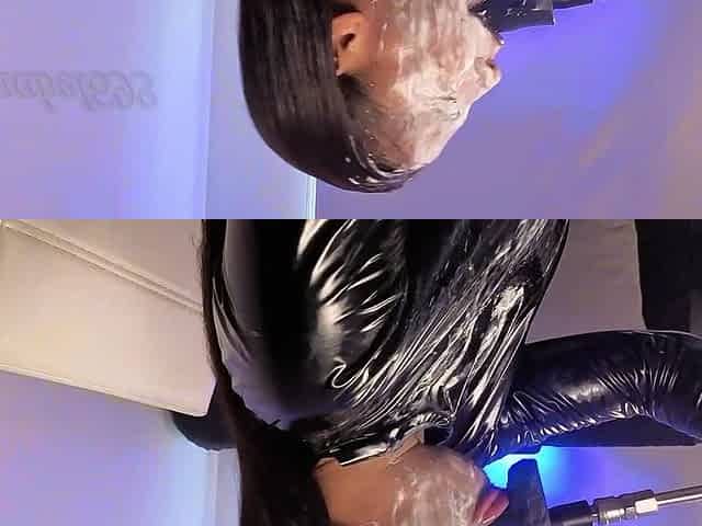 Slutty cutie with a taut booty bangs herself with a large sex-toy close-up. Immodest talk.