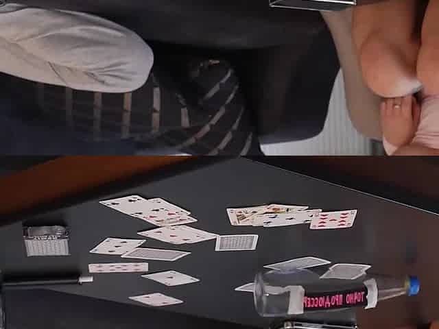 A boss with large bazookas bangs with a sextoy during work hours in her office.