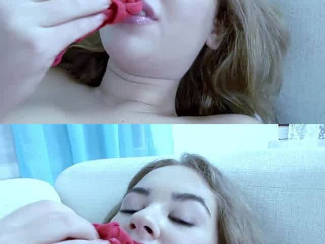 A significant amount of sperm for a well-behaved angel on the crimson bed elicits her smile