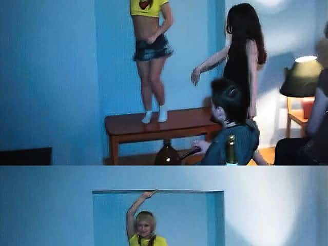 Slutty blonde and brunette coeds get banged in a foursome behind the dorm rooms doors